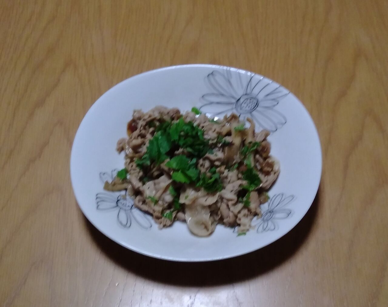 晩ごはんは、豚肉と舞茸の梅肉ポン酢です。