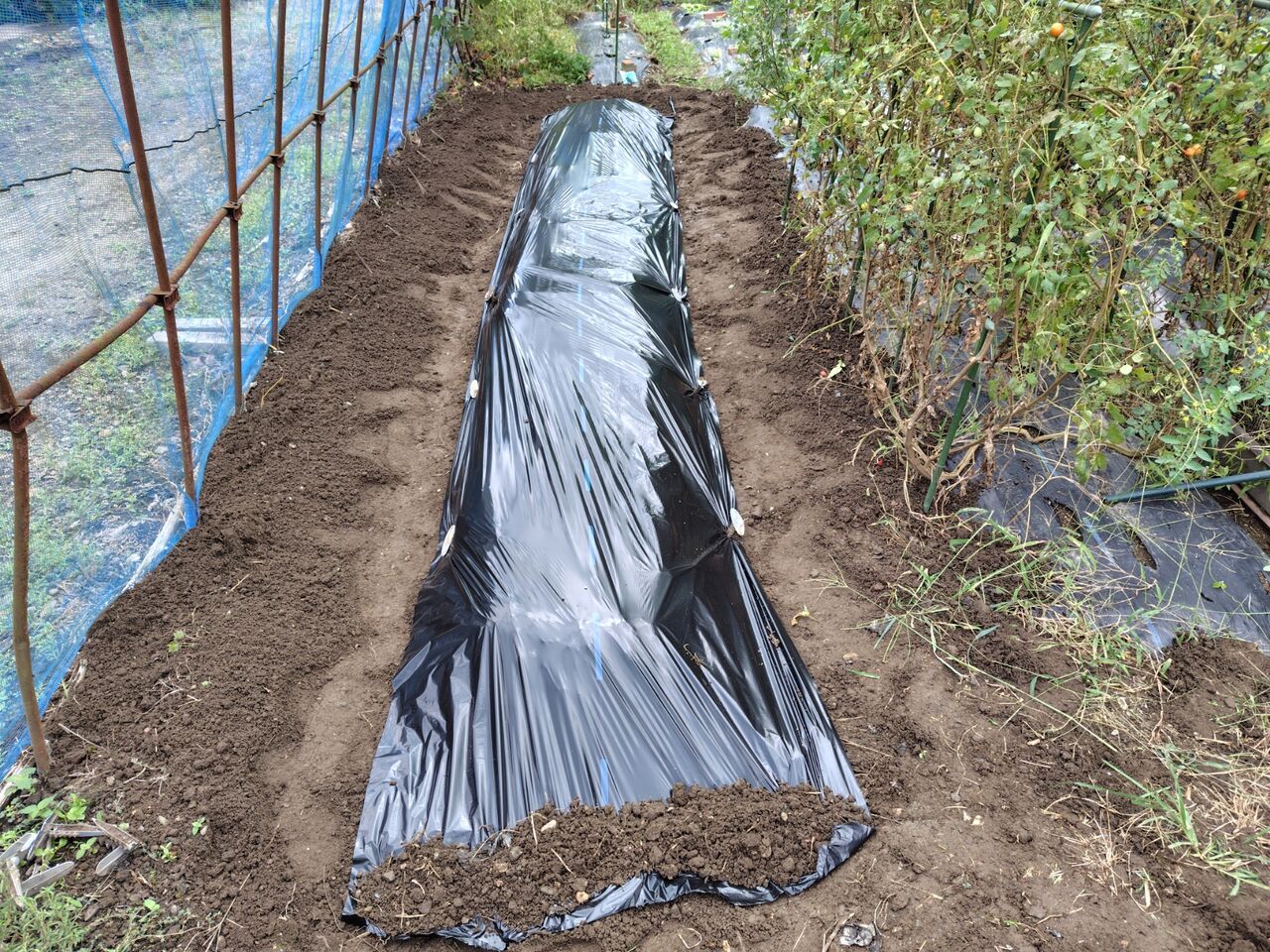 焼き鶏糞を撒いてから、カルチベーターで耕して、畝作りとマルチ張りをしました。