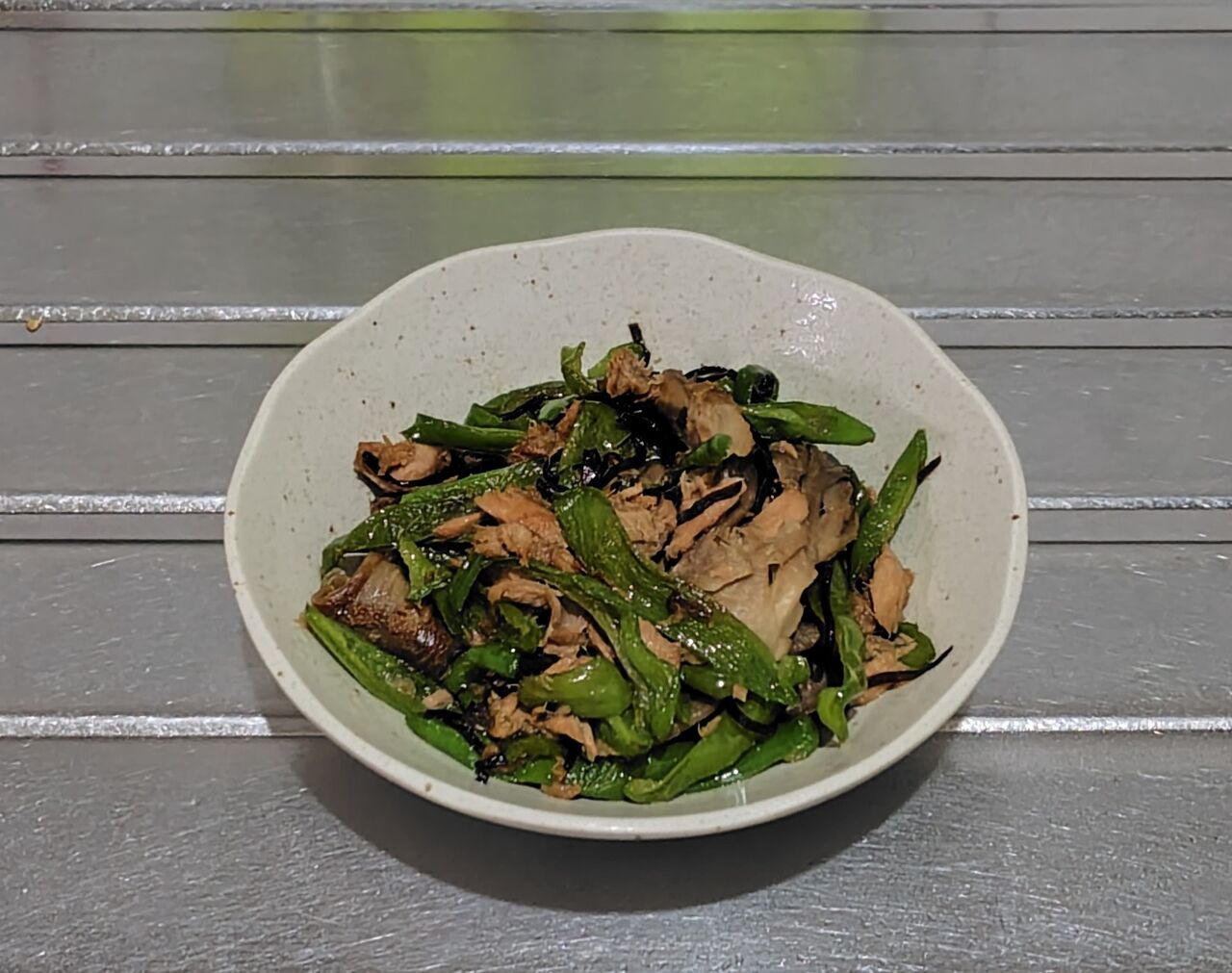 舞茸、シーチキン、塩昆布とピーマンを炒めました。