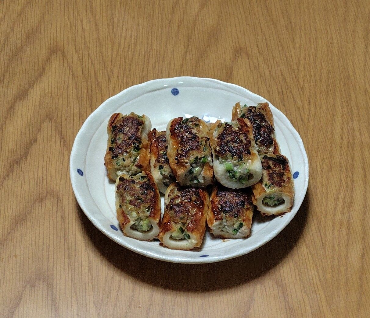 皮で包んだ餃子は、中に油や旨味が残りますが、竹輪のほうは油が抜け落ちて、ジューシーさがないです。