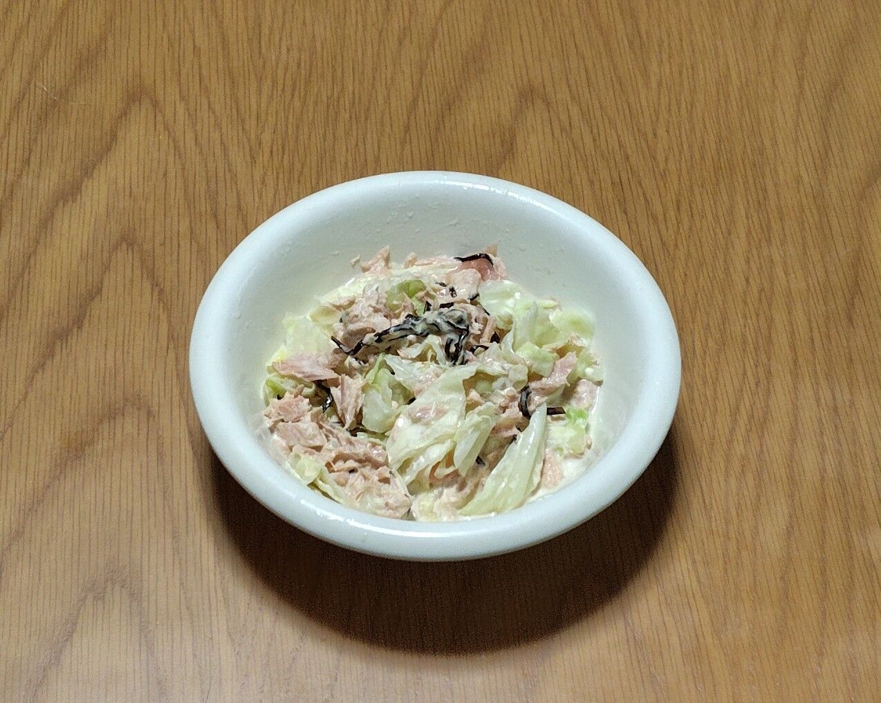 キャベツをレンチンして、シーチキンと塩昆布を和えています。