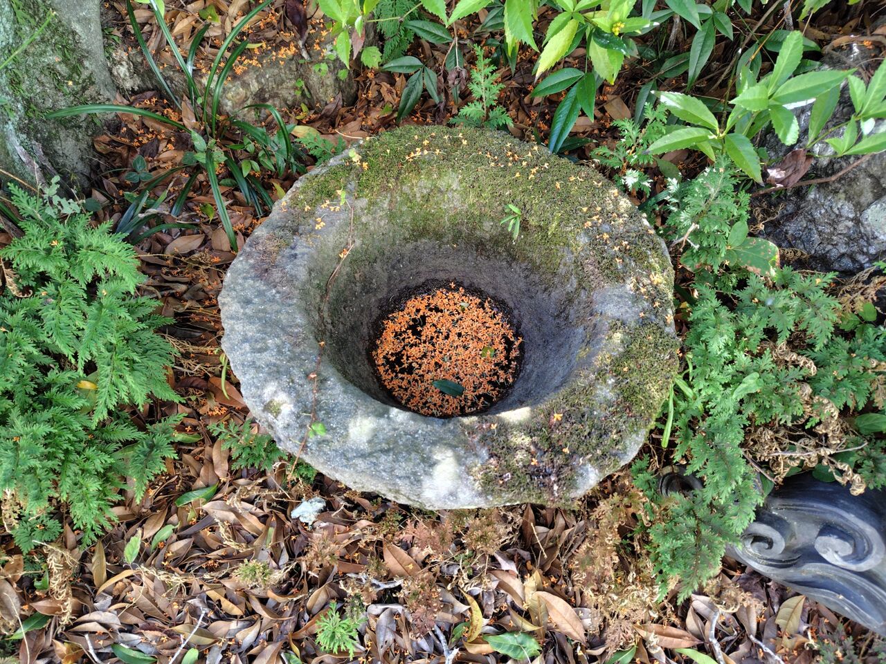 金木犀(キンモクセイ)の木の下のつくばいです。