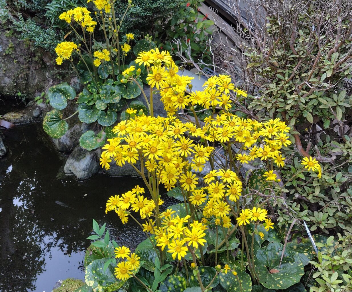 ビオトープわきの石蕗(ツワブキ)が満開です。