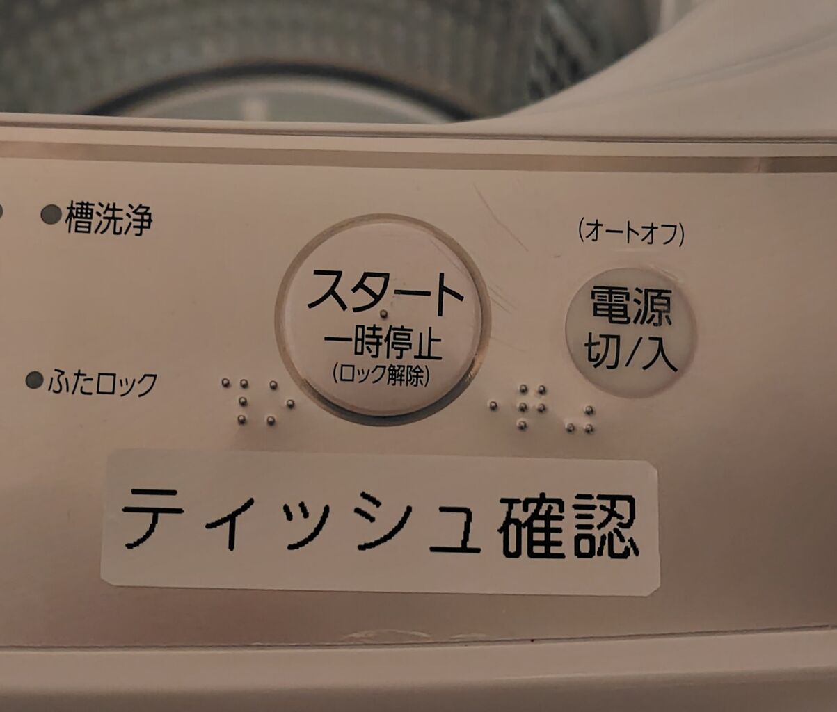 洗濯機のメニューボタンのところに、「ティッシュ確認」と書いたテプラを貼りました。