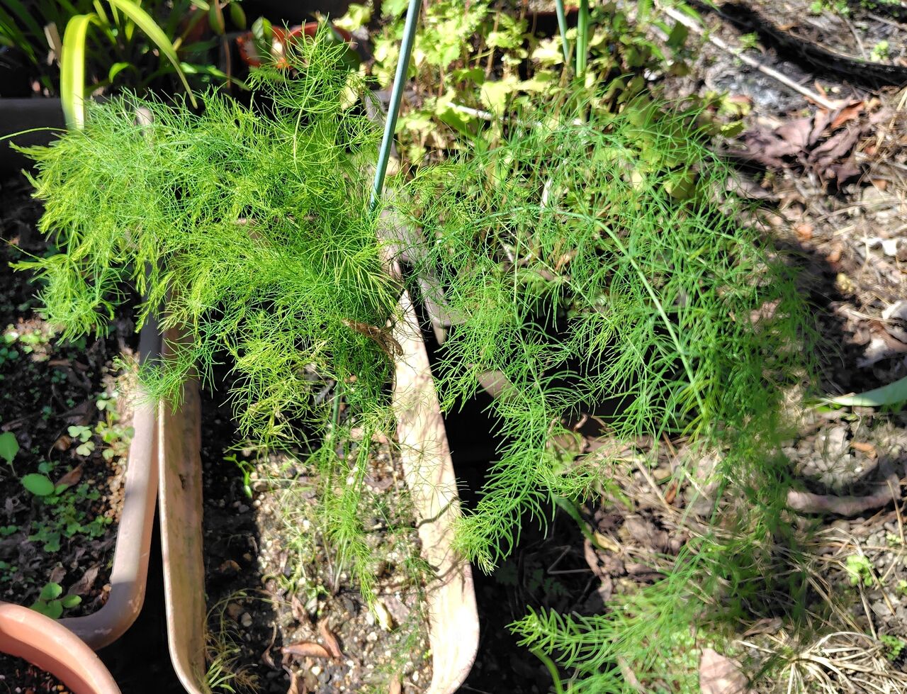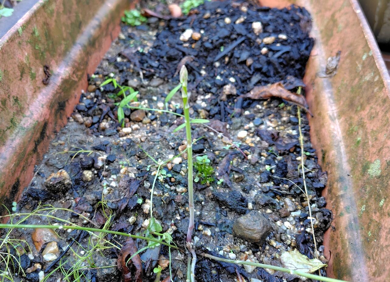 春に種まきをしたアスパラガスが、1本だけ生長しました。