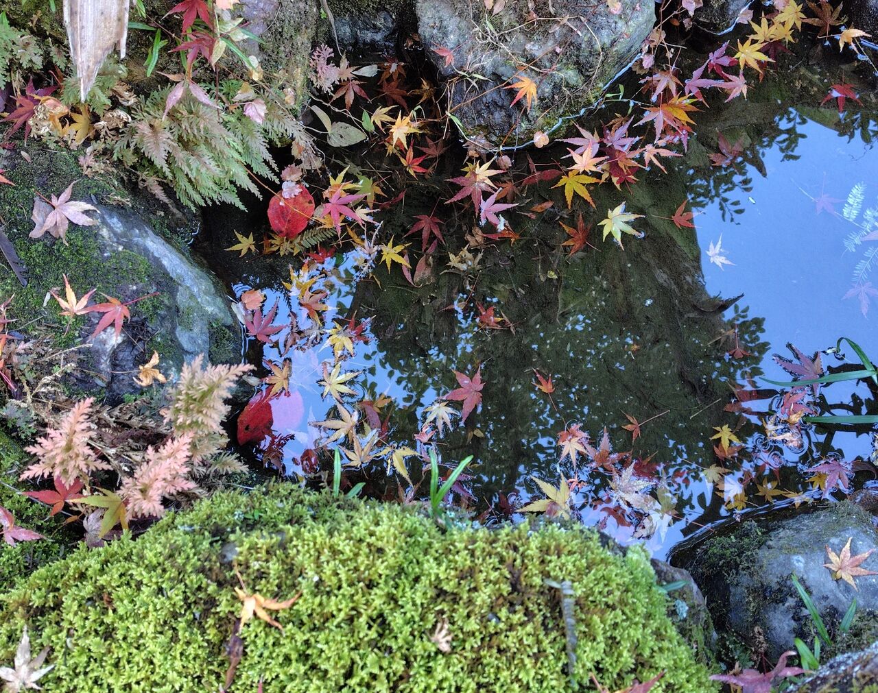 たくさんのもみじが落ちていますが、紅葉だけでなく黄色や緑色など、さまざまな色の葉が美しいです。