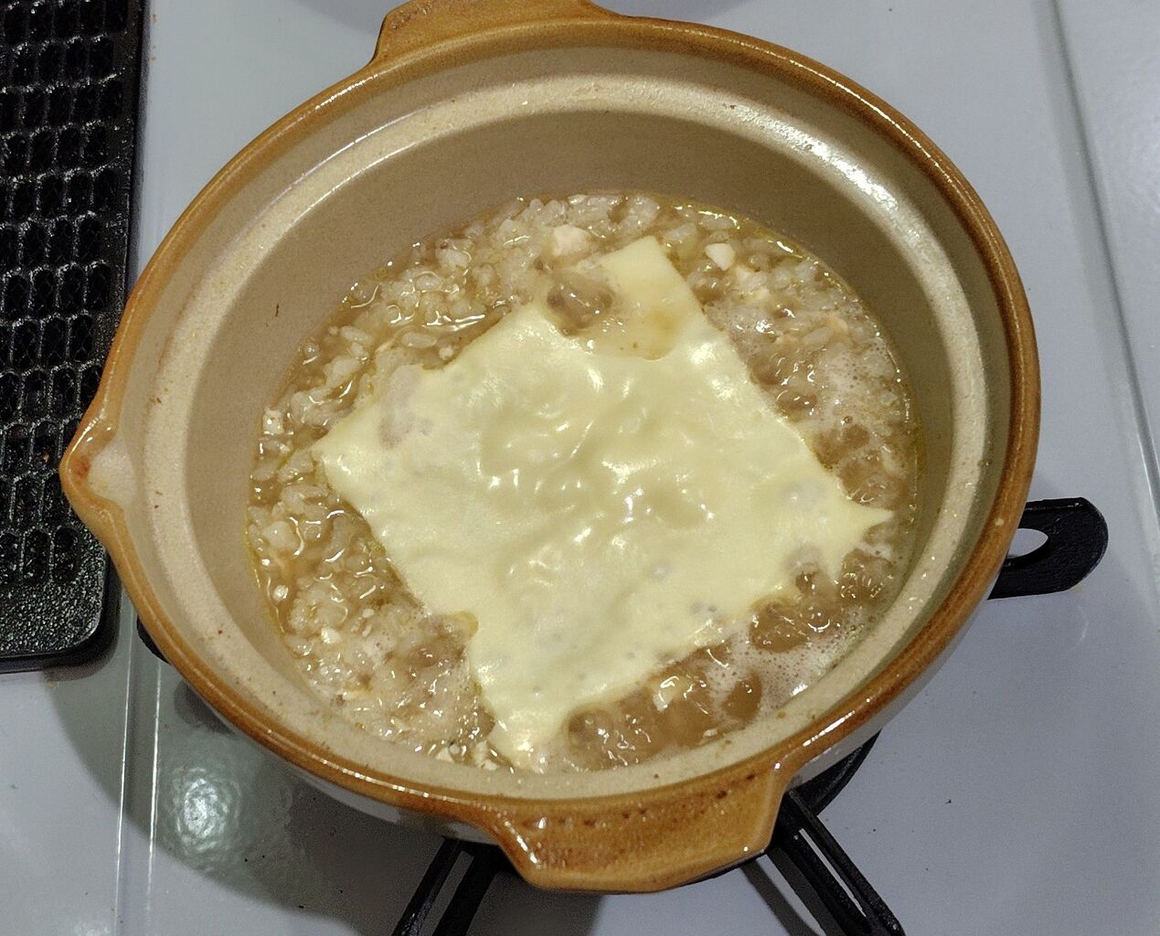 締めは、チーズを入れてリゾット風の雑炊にしました。