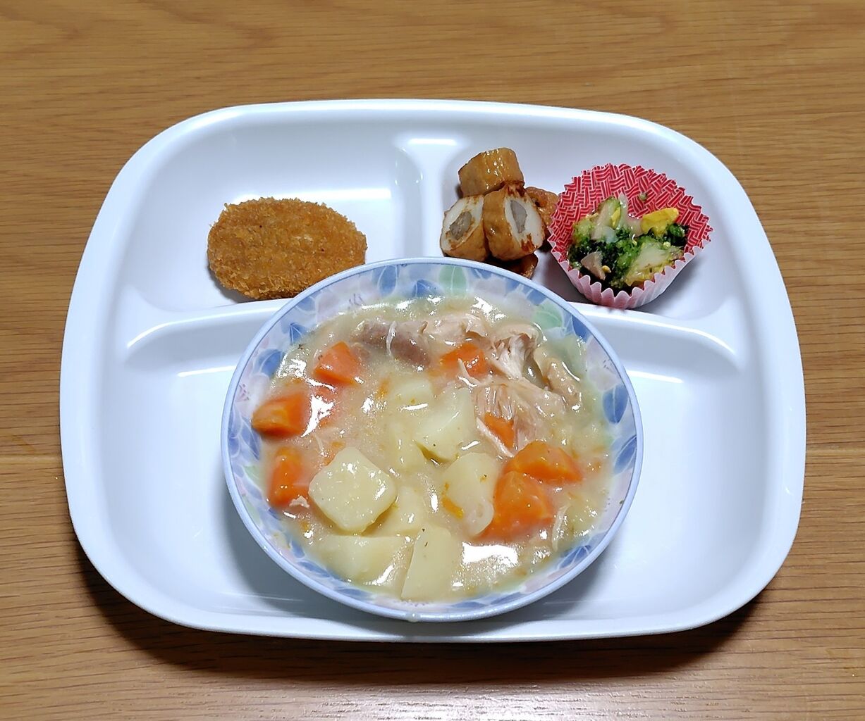 私の晩ごはんは、クリームシチューと鶏の唐揚げです。