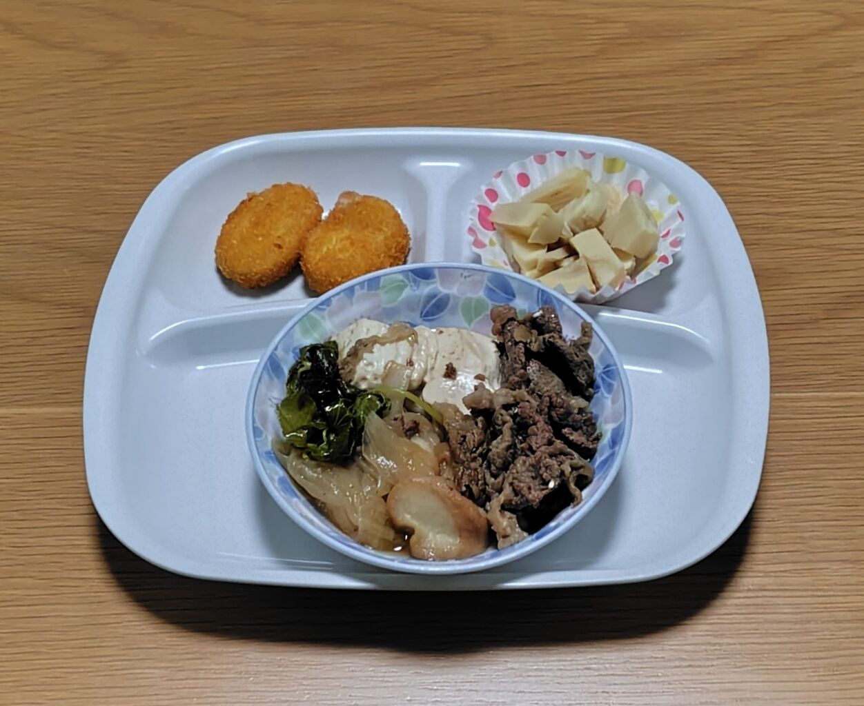 私の晩ごはんは、肉豆腐とタケノコです。