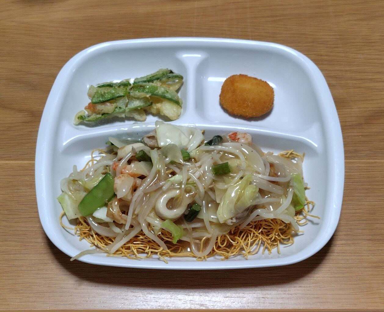 ポイントは、皿うどんにもかき揚げにも玉ねぎと絹さやが入っています。