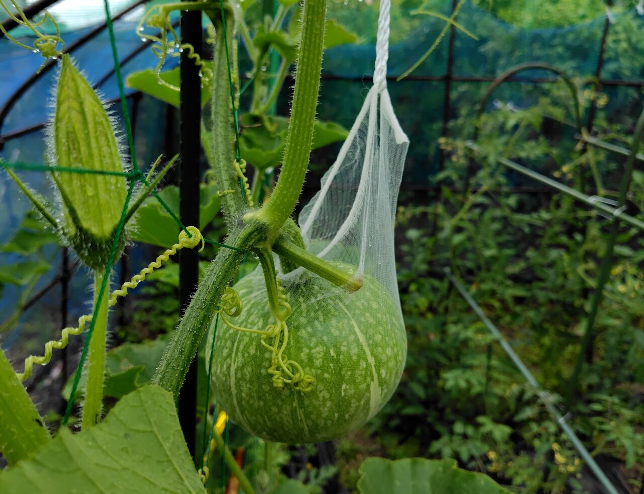 他のかぼちゃが落ちないように、排水口ネットとロープで吊るしました。