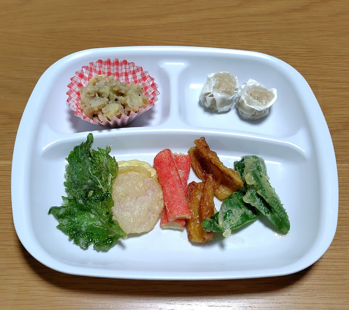 メインは、左から大葉、玉ねぎ、ジャガイモ、カニカマ、竹輪、ピーマンです。
