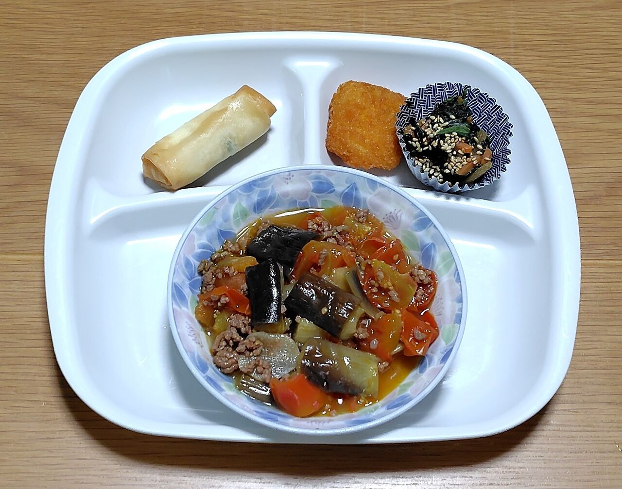 私の晩ごはんは、このトマト煮と5日ほど前に作って冷凍保存しておいた春巻きと野菜サラダです。