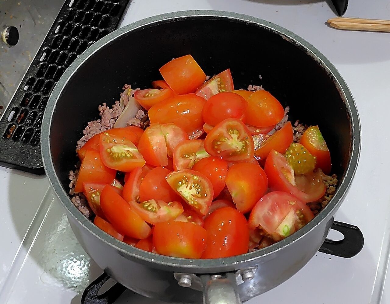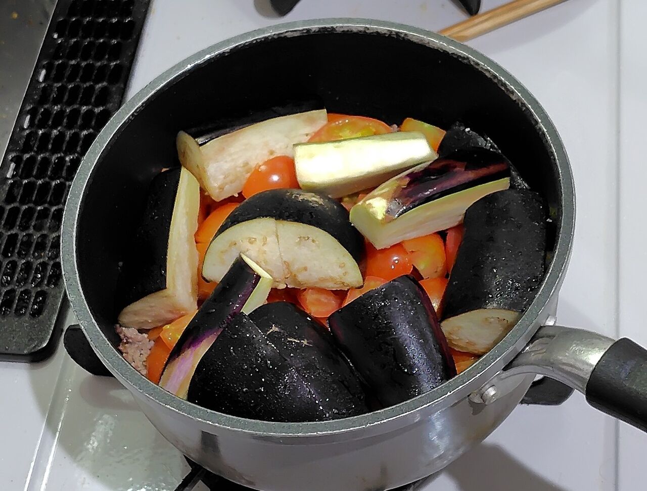 トマトを大量消費するために、久しぶりに「茄子と牛ミンチのトマト煮」を作りました。