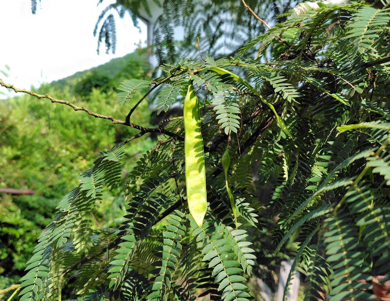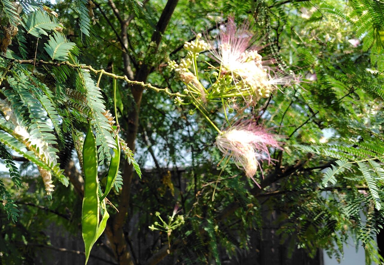 裏庭の合歓の木(ネムノキ)に豆ができています。