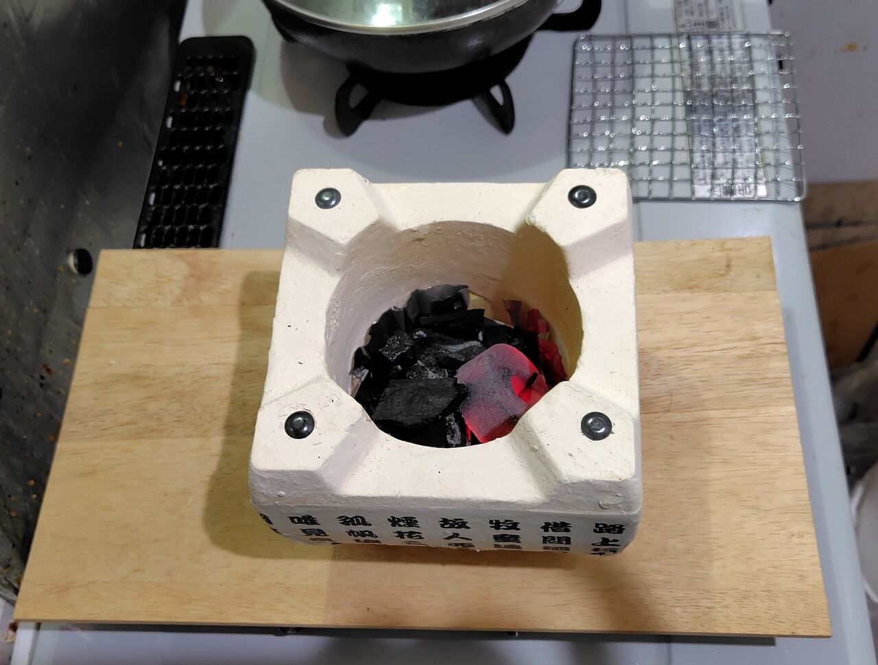 台所の換気扇の下のガスコンロに板を載せ、その上に飛騨コンロをおきました。