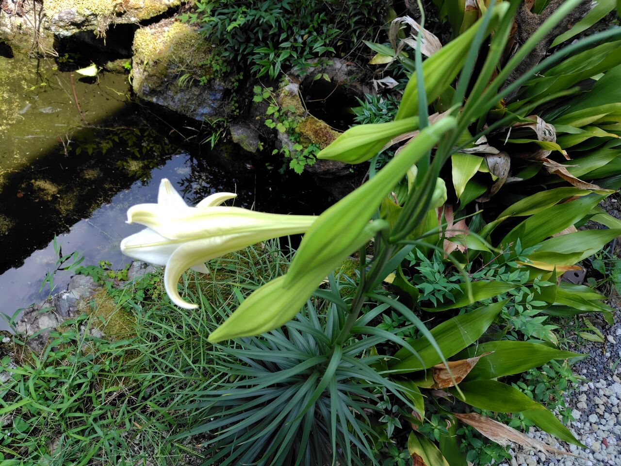 昨朝、裏庭のビオトープのそばのユリが咲いていました。