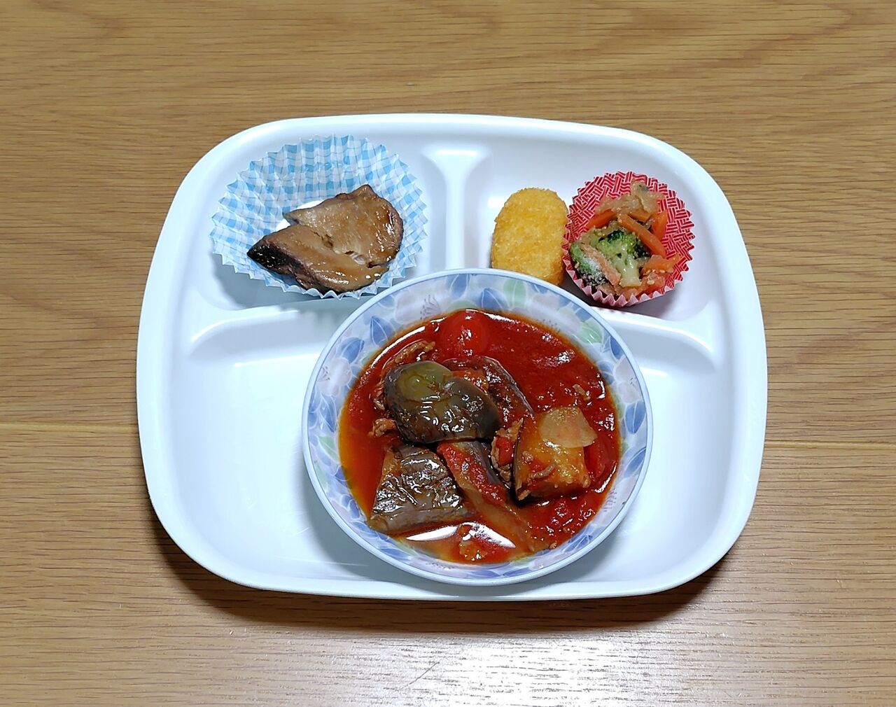 一昨日の合挽きミンチの残りで、茄子とトマトの煮物を作りました。