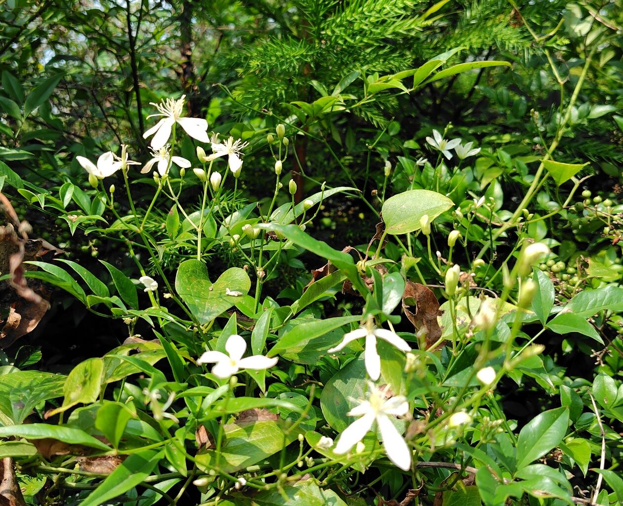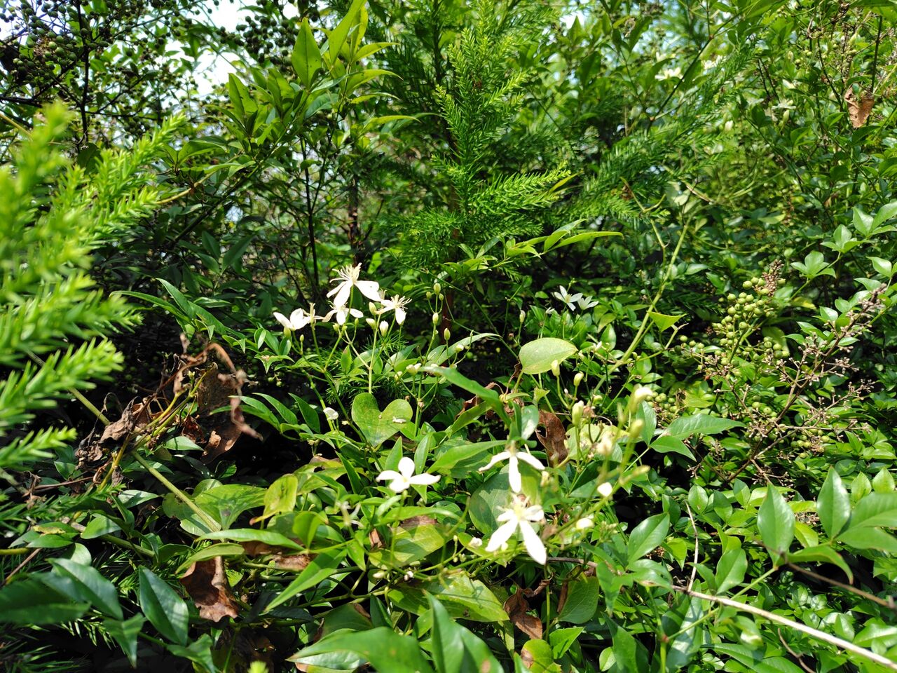 裏庭の南天の木に仙人草(センニンソウ)の蔓が絡んで、白い花が咲いています。