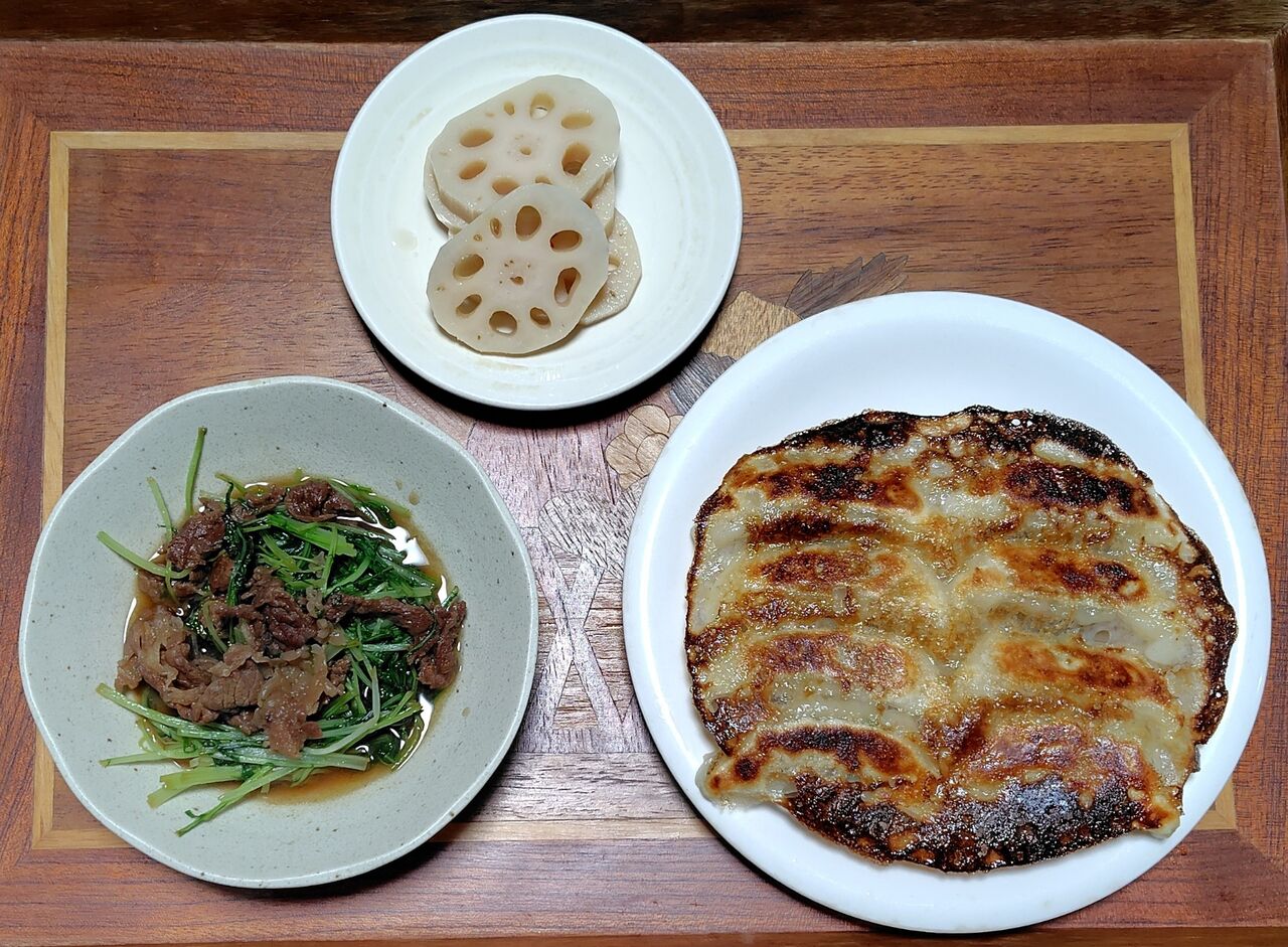 酢蓮、牛肉と水菜の煮物、餃子です。