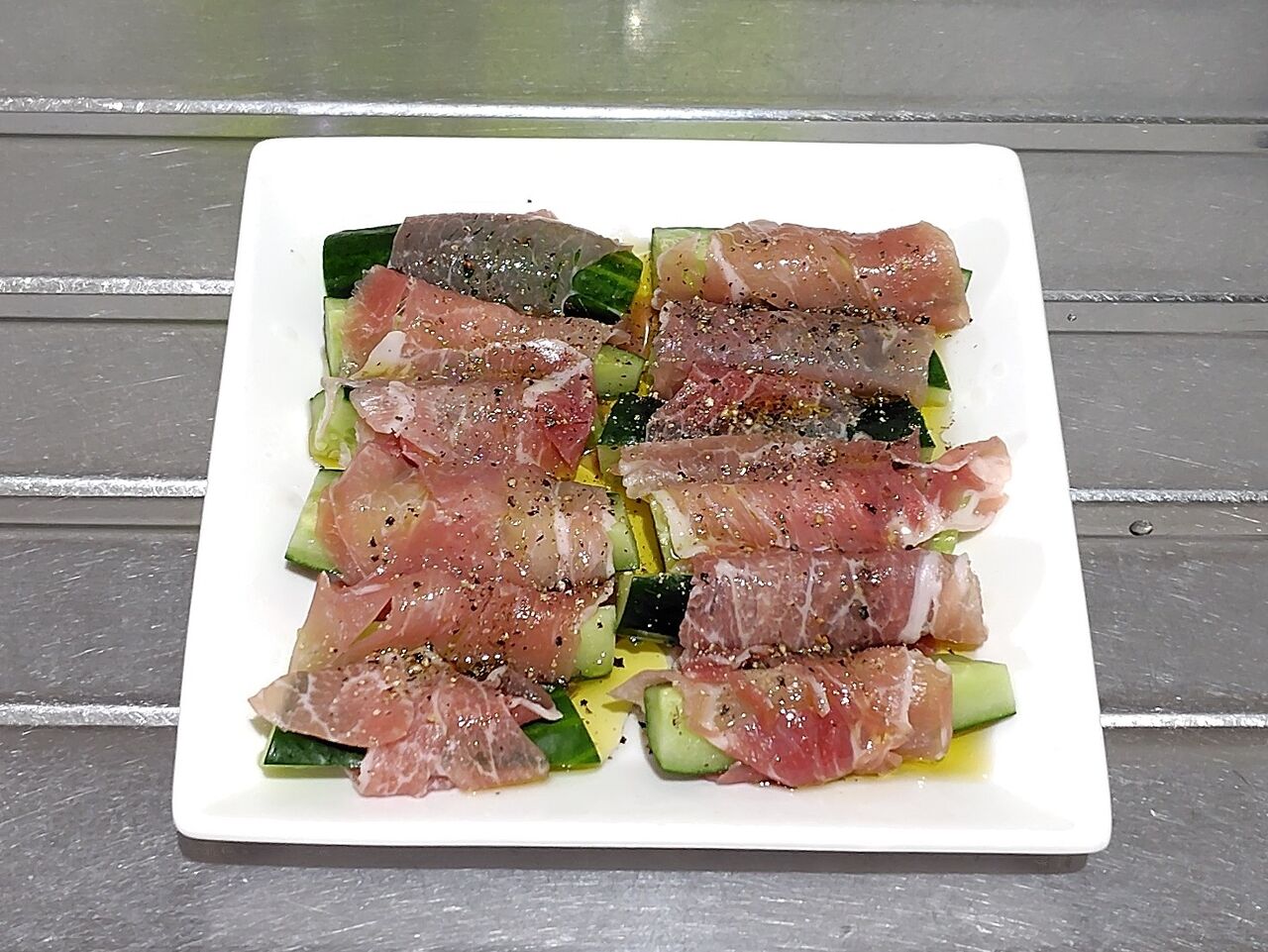 メインは、キュウリを生ハムで巻いて、オリーブオイル、レモン汁、胡椒で味付けをしました。