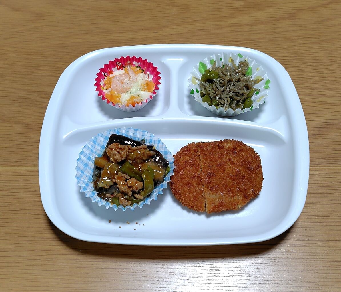 コロッケは、スーパーの惣菜、左上のグラタンは、冷凍食品です。