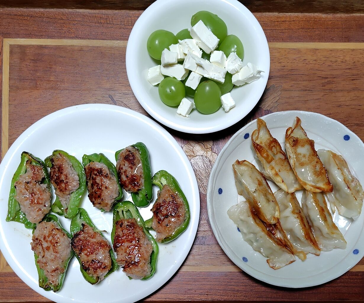 お袋の餃子の残りと、一昨日の麻婆豆腐の残りの豚挽き肉で作ったピーマンの肉詰めです。