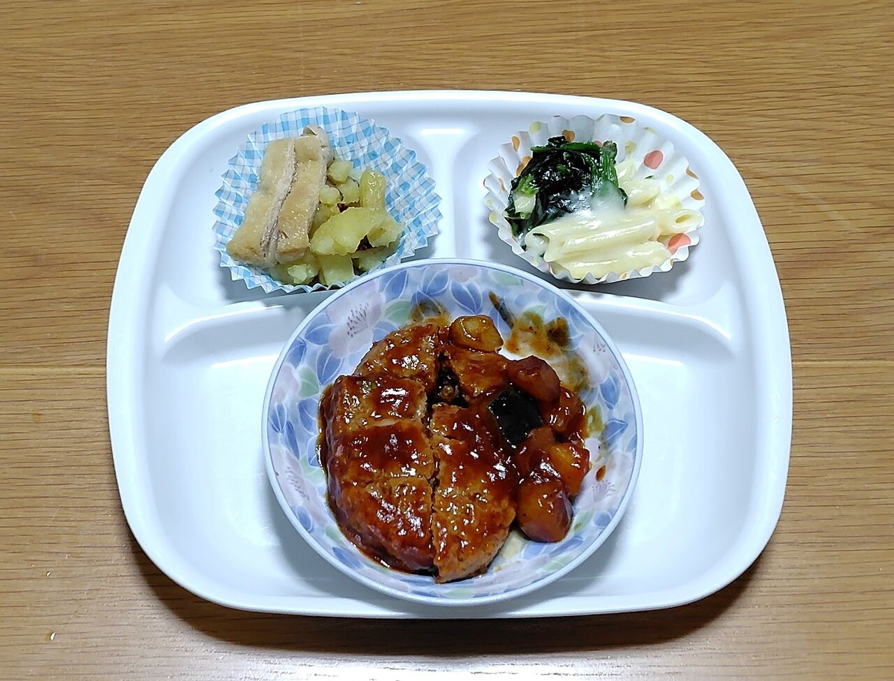 昨日も、左上のサツマイモの煮物以外は冷凍食品です。