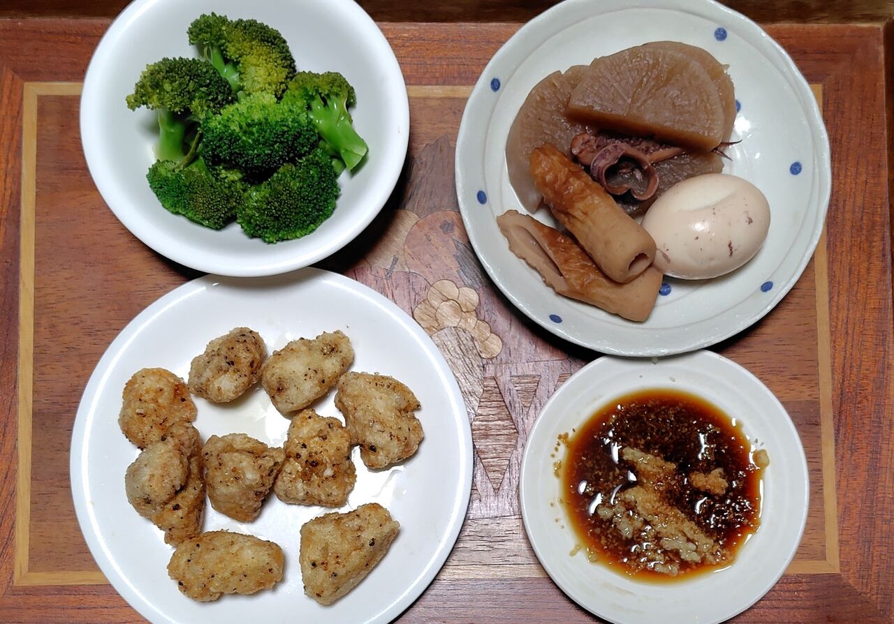 右上は、一昨々日のイカ大根をリメイクしたおでんを姫路風に食べました。