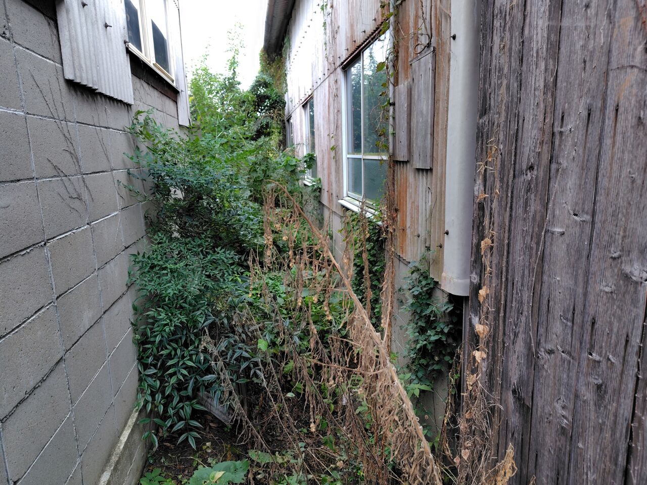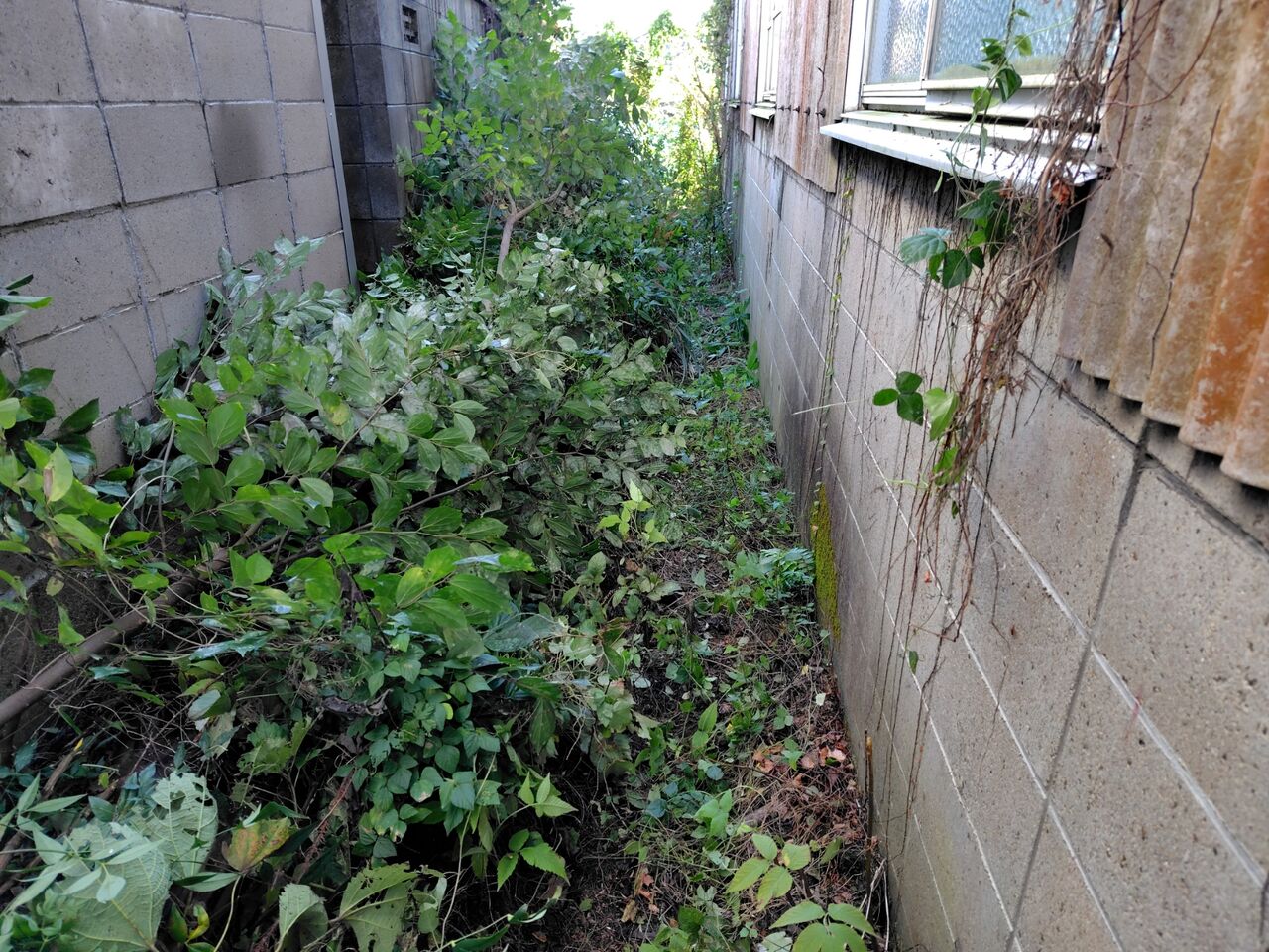 一昨日に雨で延期したわが家の倉庫と隣家のブロック塀の隙間の手入れをしました。