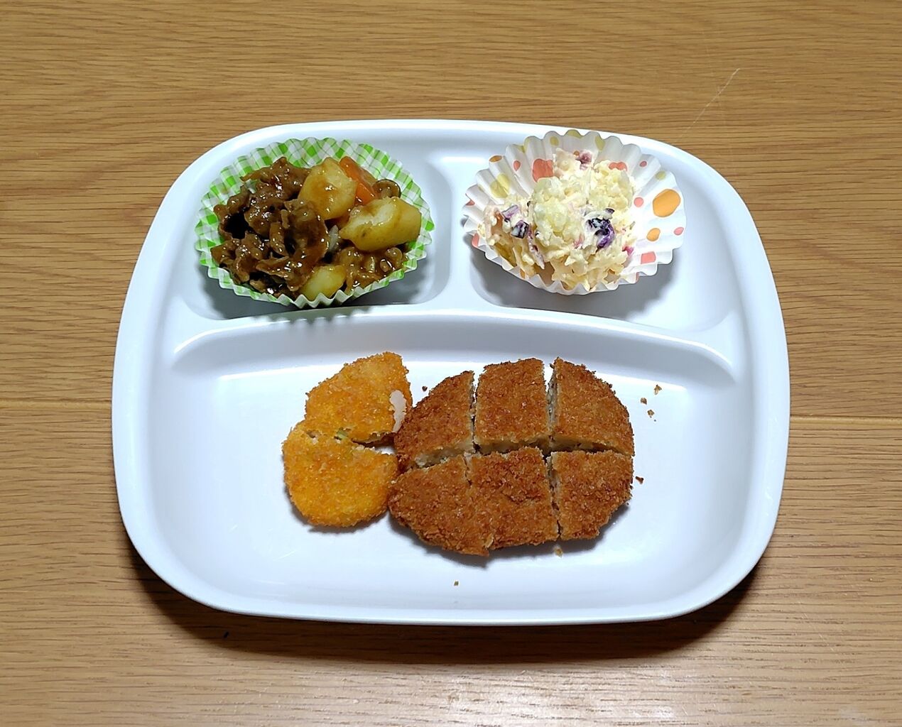 メインは、スーパーの惣菜コーナーで買ったコロッケと冷凍食品のフライです。