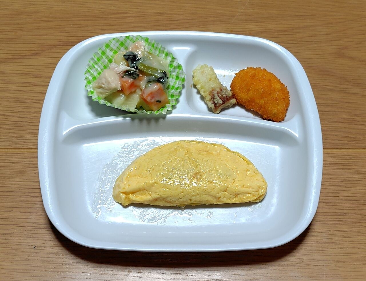 写真を撮ったあとで、調理バサミで細かくカッチし、オムレツにケチャップをかけました。