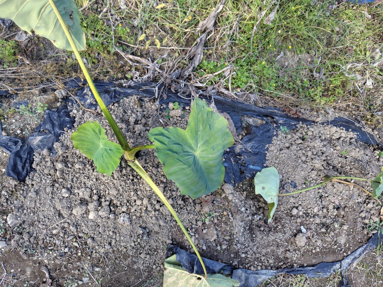 買った里芋が美味しくなかったので、今年はネットで囲われた畑で2株だけ栽培しました。