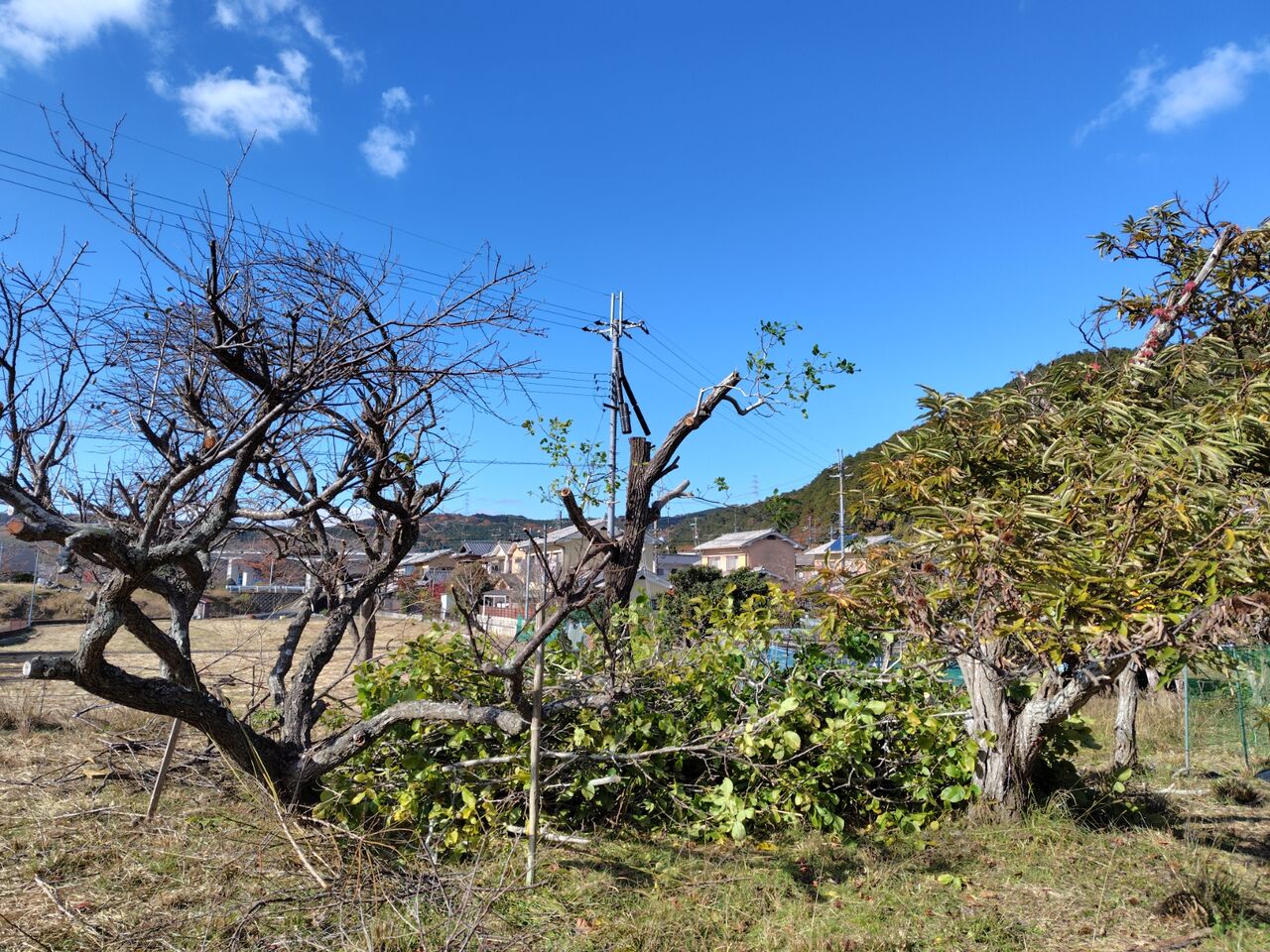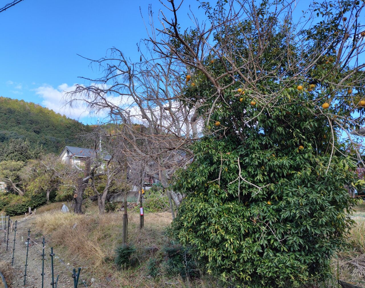 クルミの向こうに栗が3本と柿の木が道に面しています。