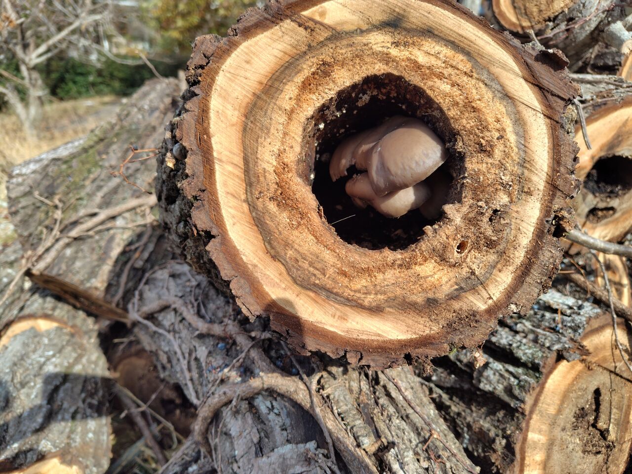 丸太の中心部分が空洞になっています。その空洞にキノコが生えていました。