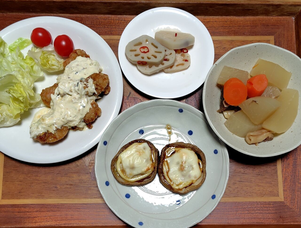 鶏唐揚げに、自分で作ったタルタルソースをのせて食べました。