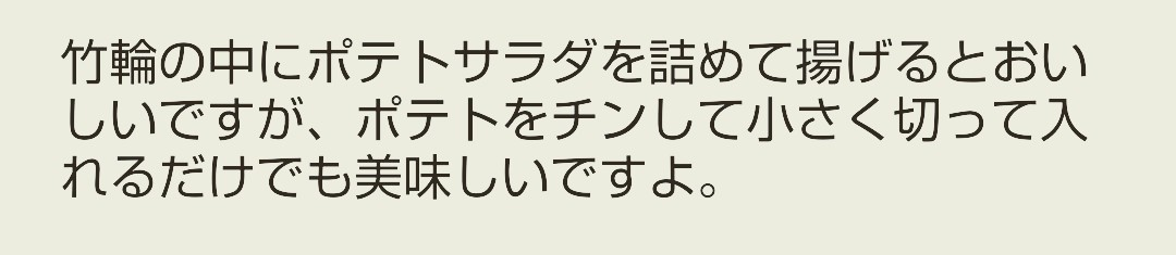 以前に、竹輪にポテサラを詰めて、春巻きにしたことがあります。(【関連ページ】参照)