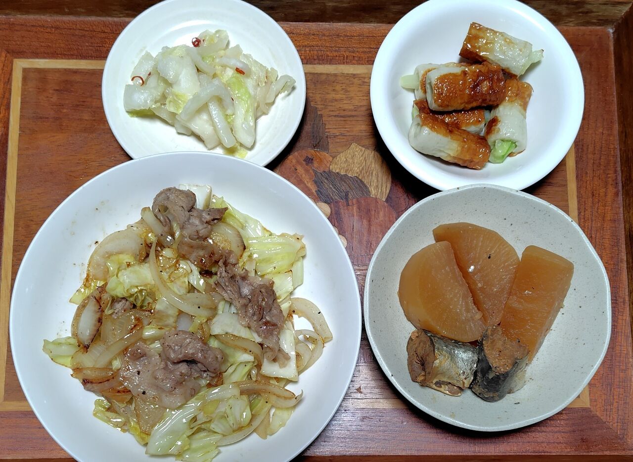 右下は、大根と鯖の缶詰味噌味の煮物です。一昨日の残りです。