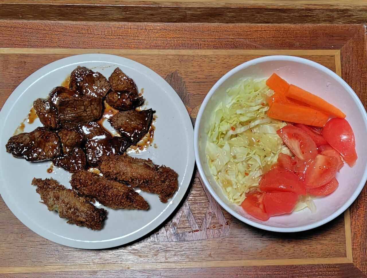 左の皿の下は、キウイを豚スライスで巻いた豚カツです。