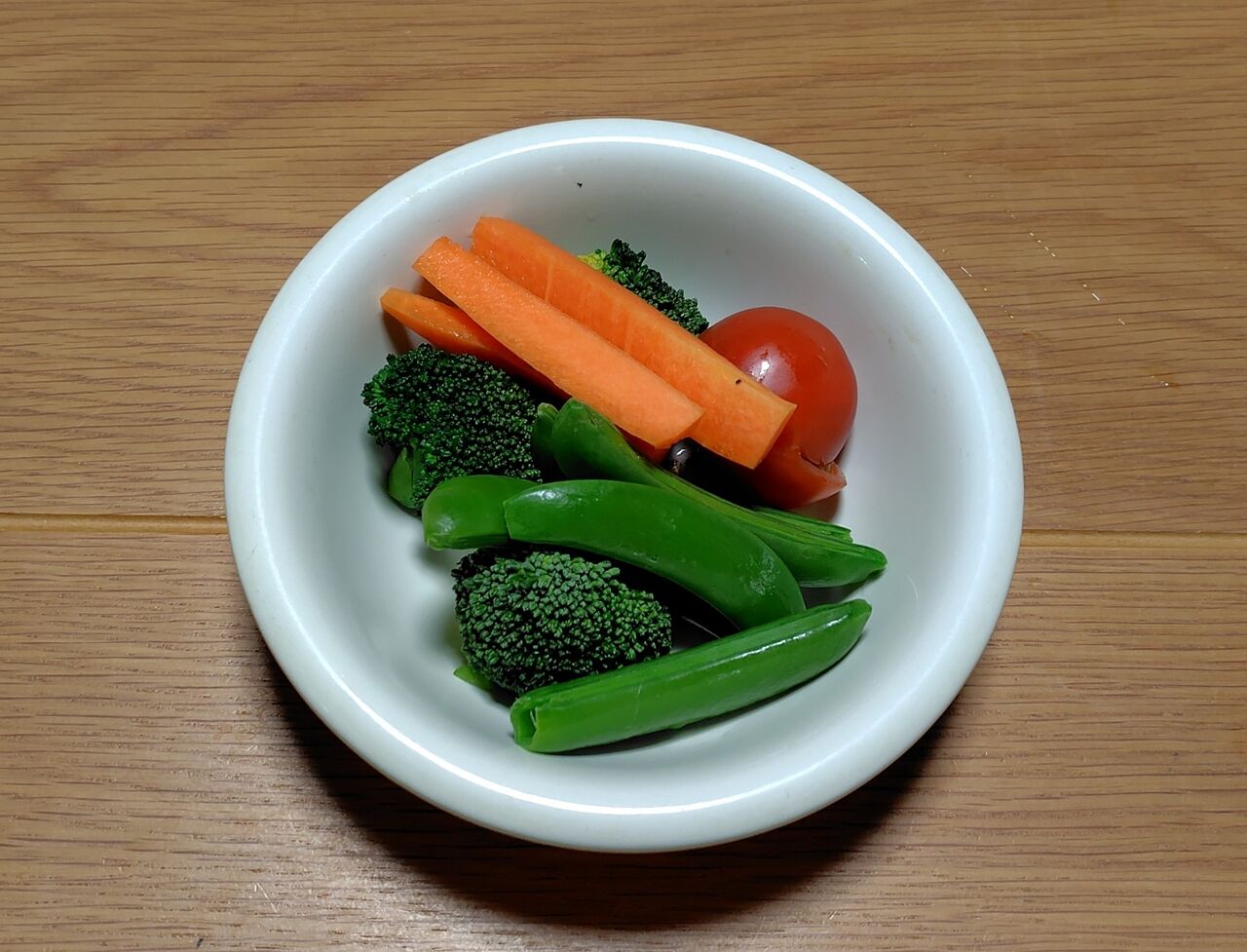 野菜は、ブロッコリー、スナップエンドウ、ニンジン、トマトです。