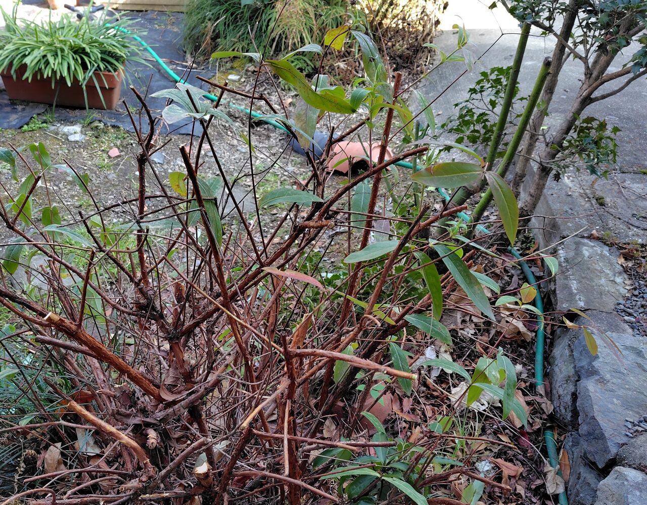 裏庭のビヨウヤナギとヒイラギの剪定をしました。