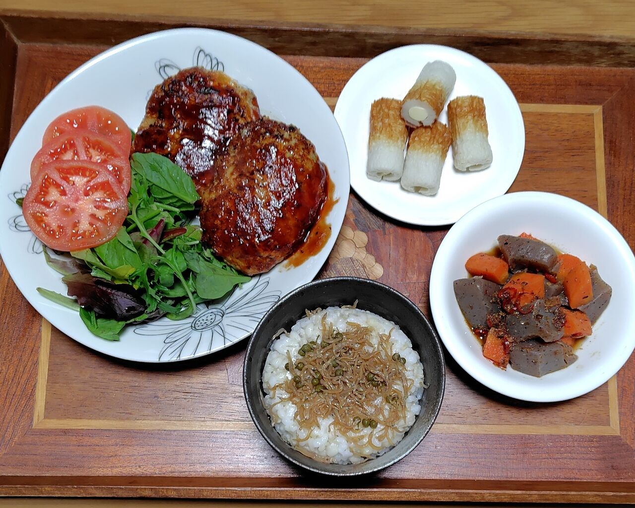 中央下は、もち麦に自分で作ったちりめん山椒を振りかけました。