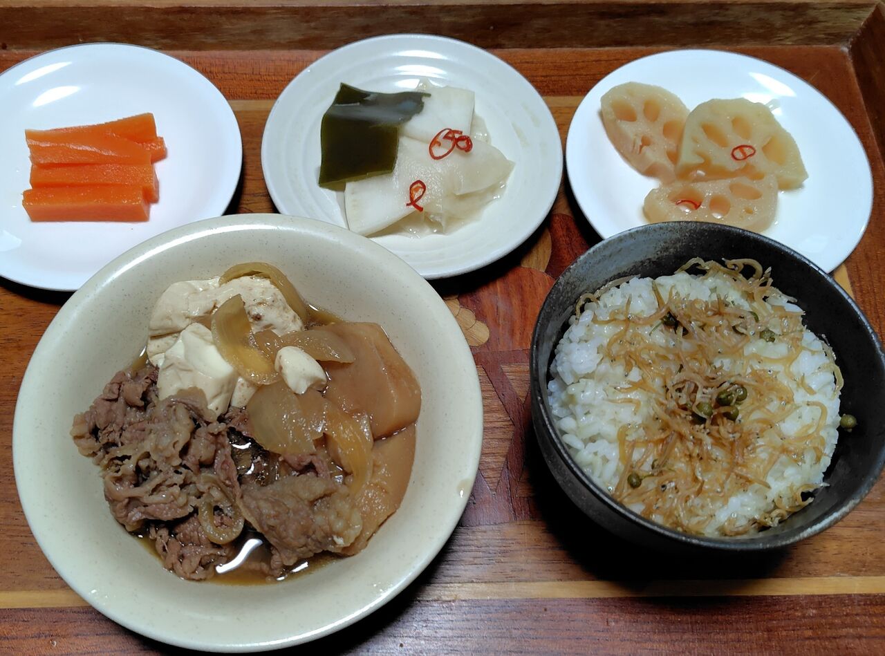 ニンジンのピクルス、カブの千枚漬け、酢蓮根は、一昨日のバーニャカウダの残りを漬け込んでおいたものです。
