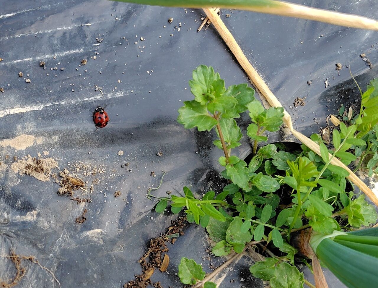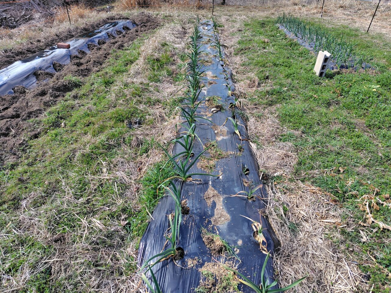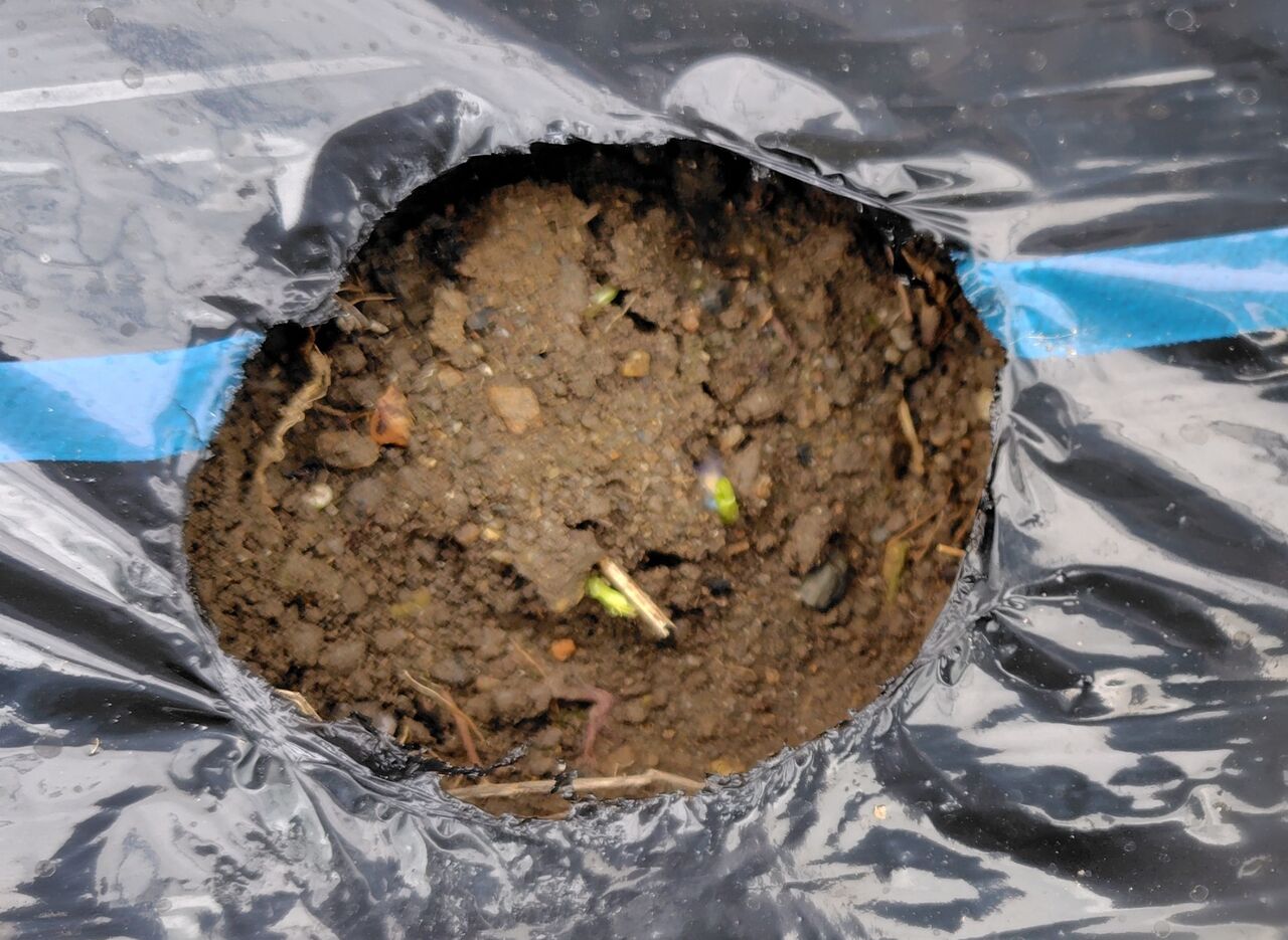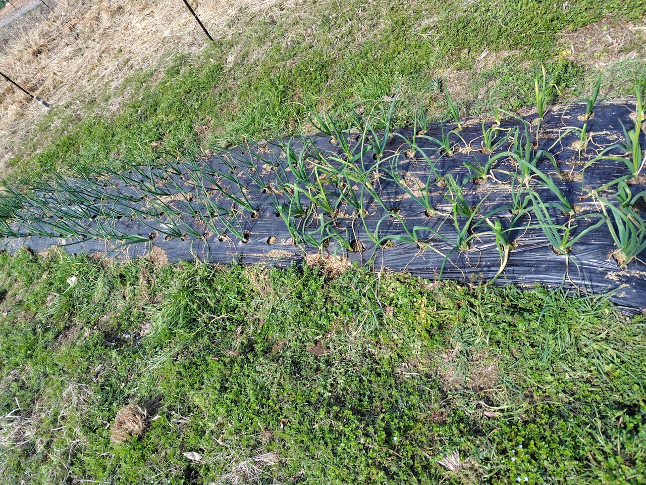 その後、玉ねぎ🧅とニンニクのマルチ穴の草むしりと追肥をしました。