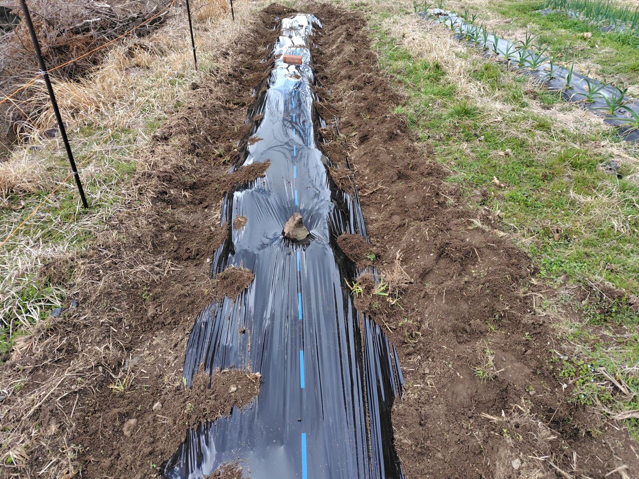 業者さんが帰ってから、先日畝立てをした畑にマルチを張りました。