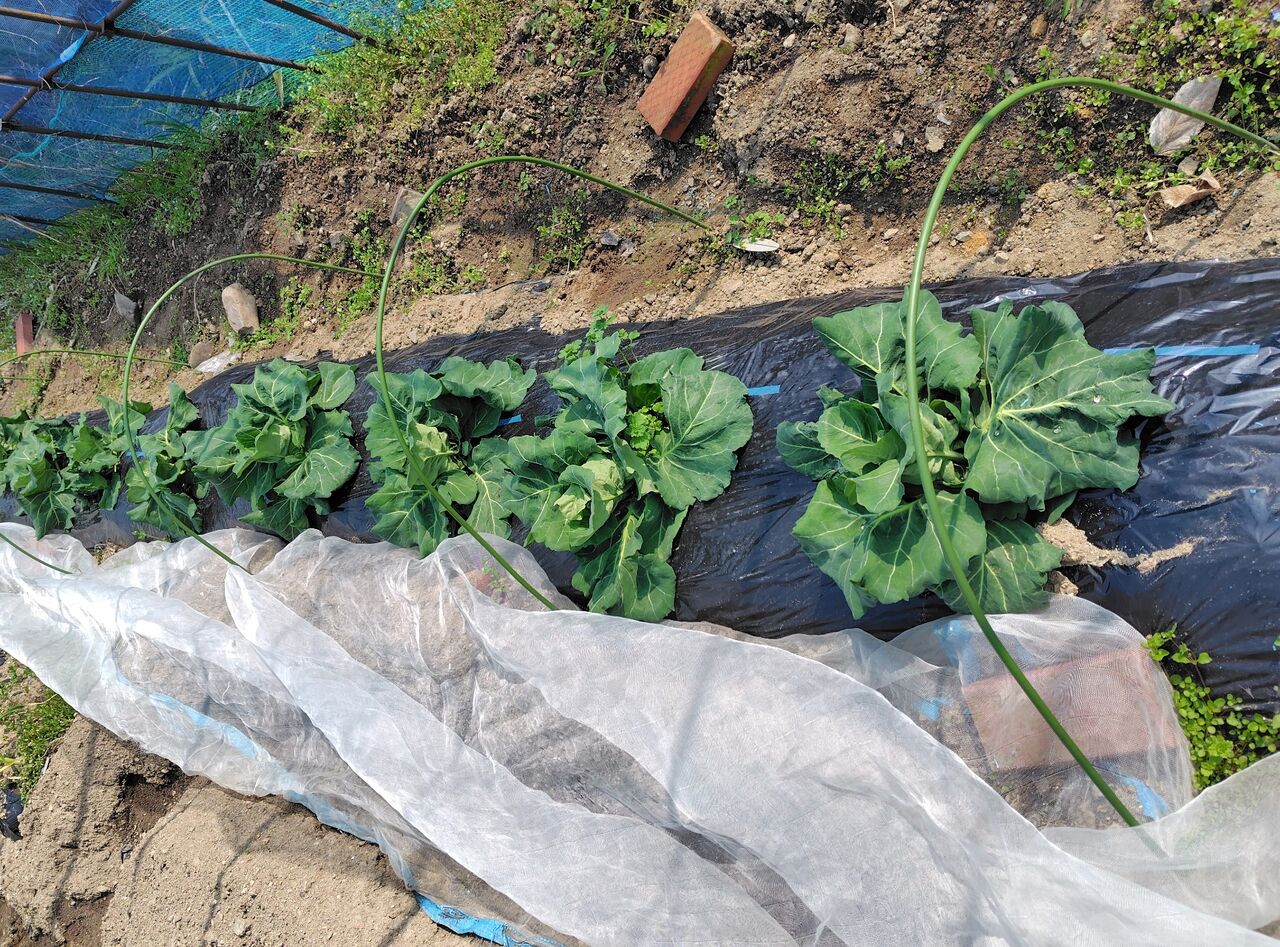 芽出しができたジャガイモが10個ほど余っていたので、キャベツとキャベツの間に植えておきました。