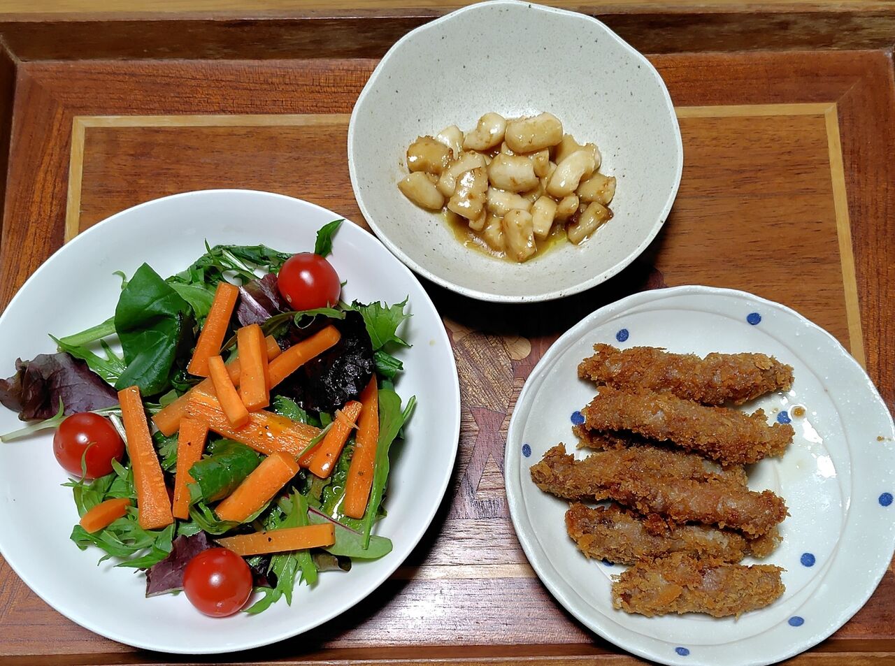 メインは、フレンチフライを豚スライスで巻いた豚カツです。