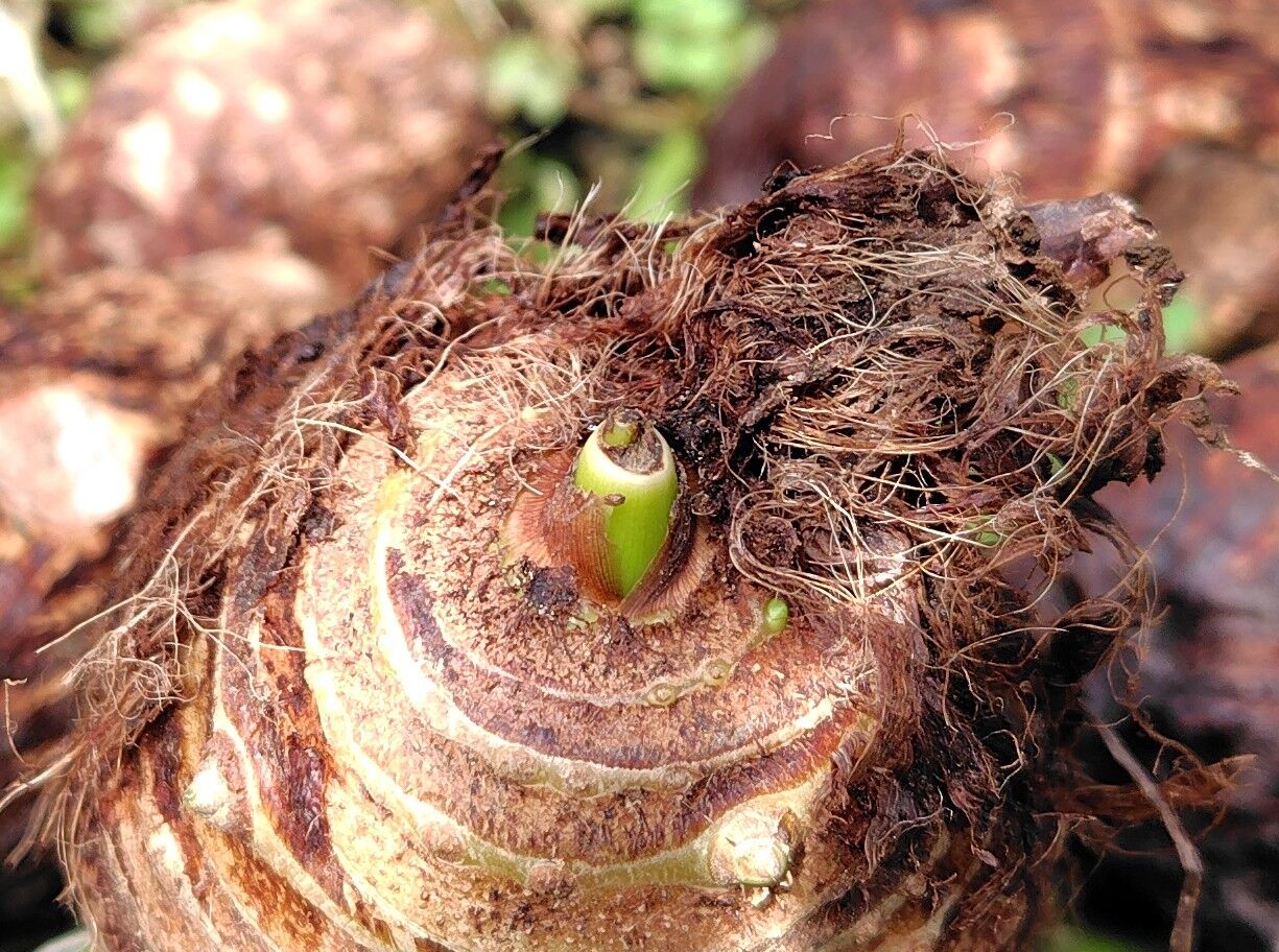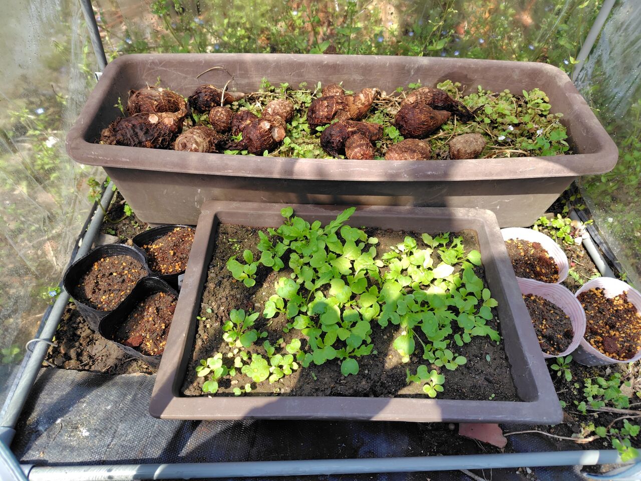 プランターの上に転がっているのは、ホームセンターで買った里芋です。