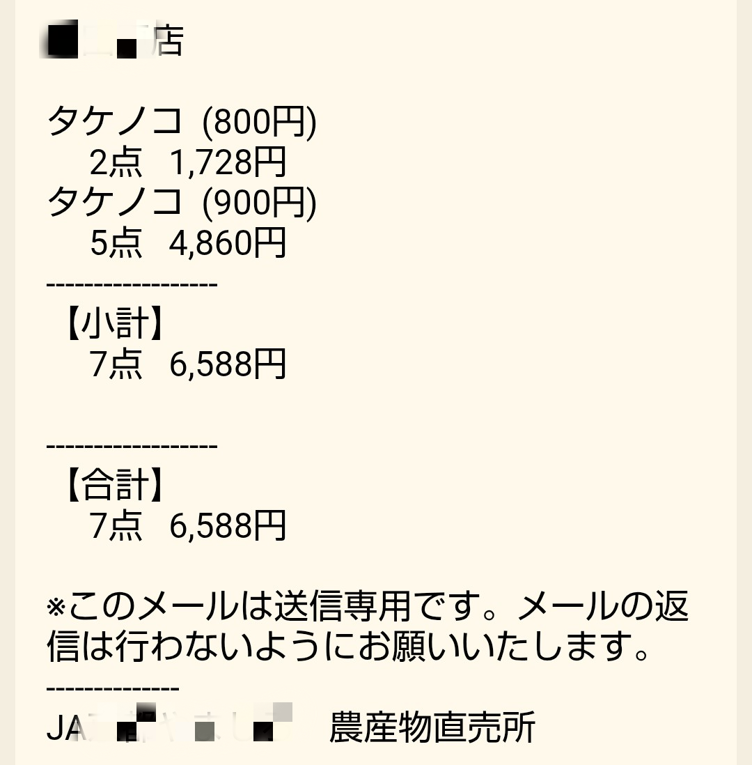 昨日、JA直売所から来た売上メールです。
