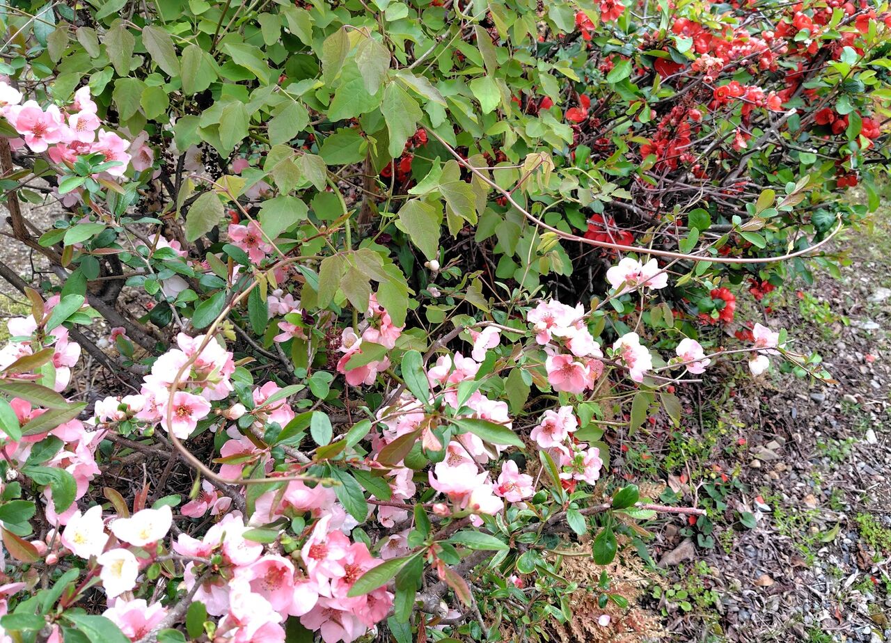 母屋の庭で咲いている紅白の木瓜の花です。